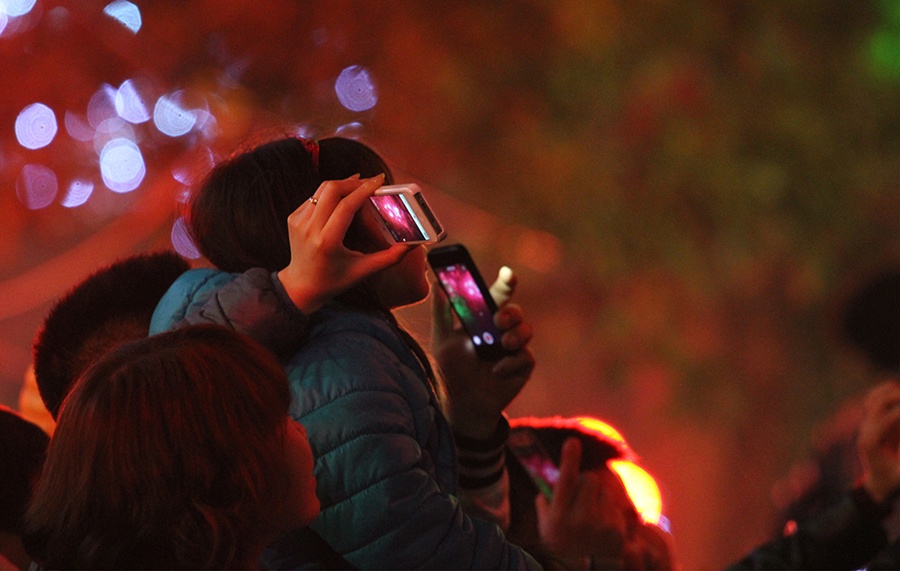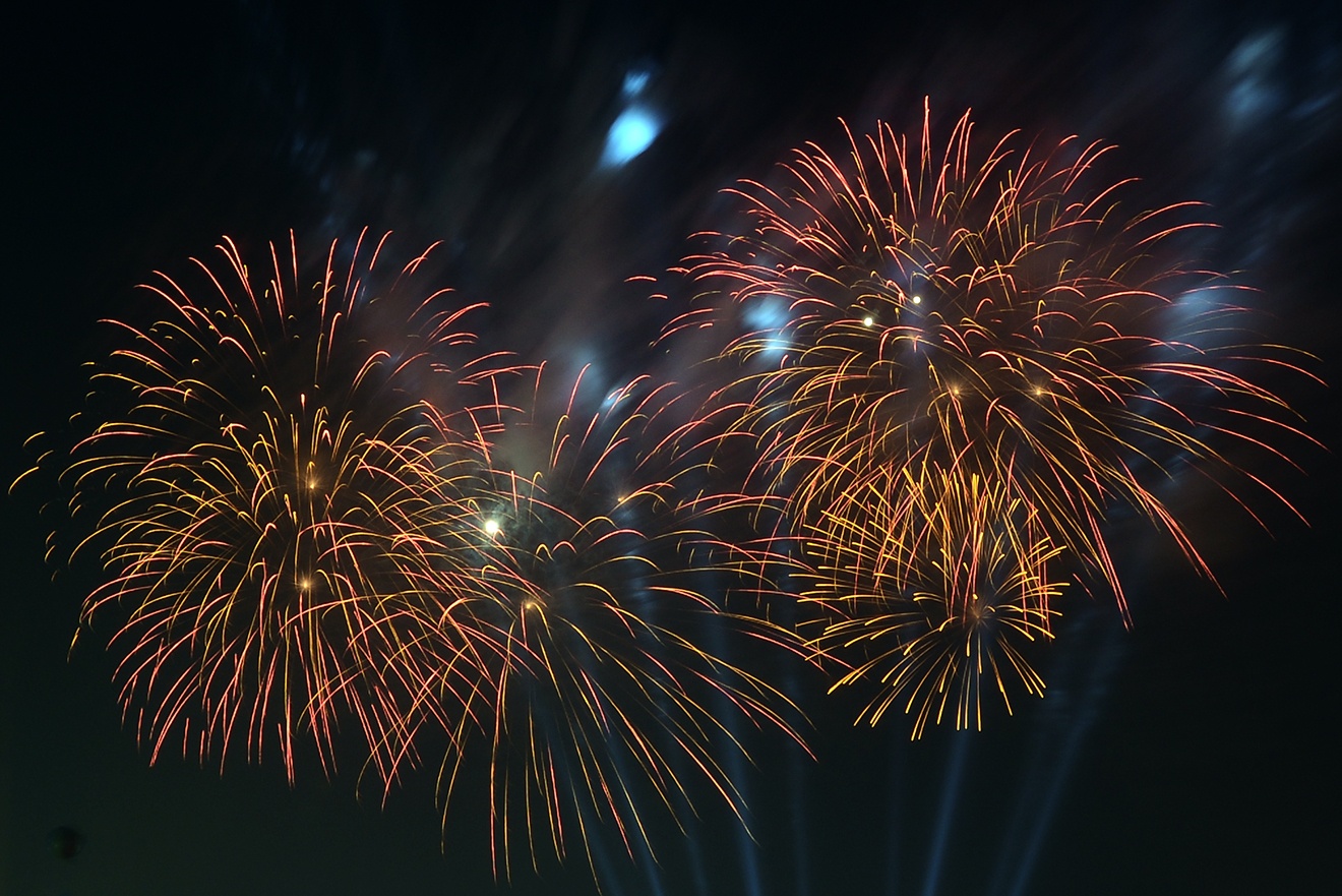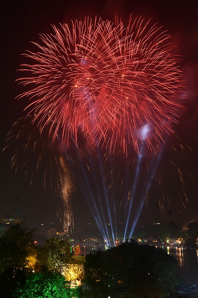 | Pháo được bắn lên chụm lại ở khu vực giữa hồ kết hợp cùng ánh sáng laser khiến cho những chùm hoa sáng rực trên bầu trời. |