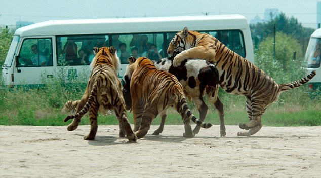 | Con bê trở thành món mồi ngon cho bầy hổ tại một khu bảo tồn động vật ở Harbin, Trung Quốc. Bầy thú lao vào xẻ thịt con bê tội nghiệp. Ảnh: Chris Geddes. |