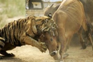 | Con bò không thoát khỏi móng vuốt của cọp. Hổ là một loại thú dữ ăn thịt sống. Chúng là động vật to lớn nhất trong họ Mèo và là động vật lớn thứ 3 trong các loài thú ăn thịt sau gấu trắng và gấu nâu. |