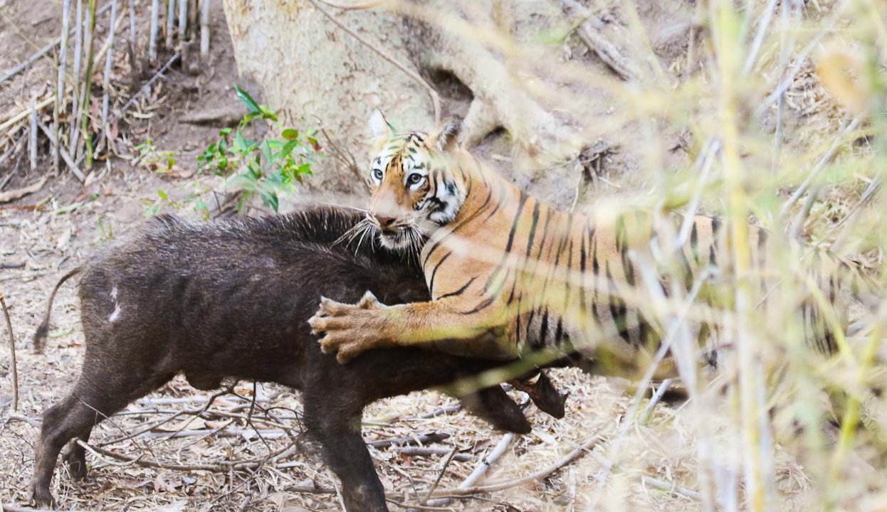 | Hổ "xử" lợn rừng. Ảnh: Carnivoraforum. |