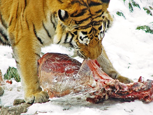 | Cận cảnh một bữa ăn của hổ. Hổ thường đi săn đơn lẻ. Thức ăn của chúng chủ yếu là các động vật ăn cỏ cỡ trung bình như hươu, nai, lợn rừng, trâu. Tuy nhiên, chúng có thể bắt cả những con mồi to hơn nó. Ảnh: Animalstime. |