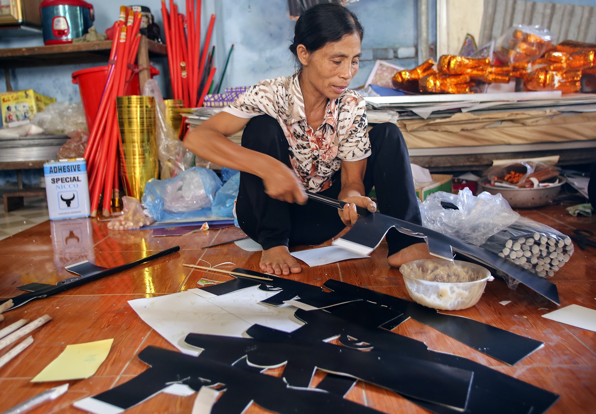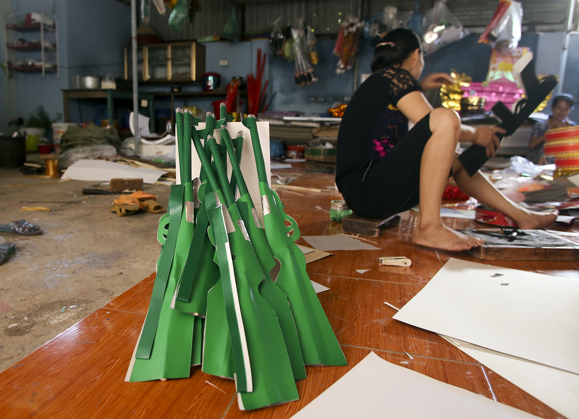Đông Hồ nổi tiếng là làng nghề với dòng tranh cổ nhưng nhiều năm gần đây các nghệ nhân còn làm thêm công việc sản xuất vàng mã phục vụ nhu cầu khách hàng. Nếu như những mặt hàng quen thuộc các năm trước như quần áo, mũ, xe máy, ôtô bằng giấy giống với đồ dùng của người trần gian không còn là lạ thì năm nay, nhiều cơ sở đã sáng tạo ra nhiều mặt hàng lạ. Trong ảnh là súng dài, có thể tượng trưng cho súng trường, súng hơi bắn chim, tùy quan điểm của khách.