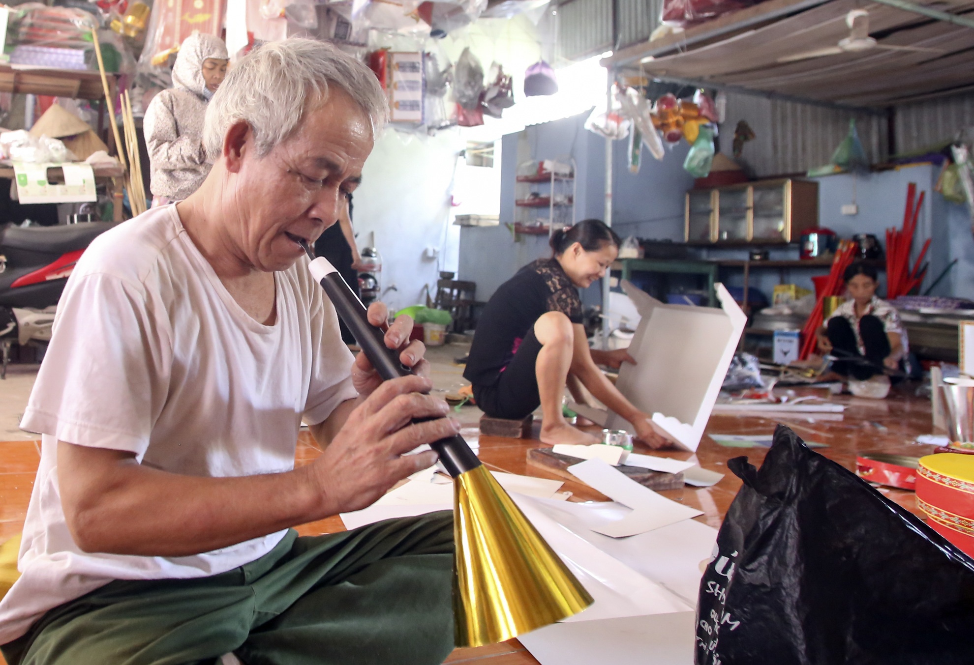 Kèn đám ma tại xưởng của ông Nguyễn Thiện Thỏa. Chủ xưởng cho biết, những mặt hàng lạ này thường làm theo đơn đặt hàng, không sản xuất đại trà như quần áo, giường tủ.