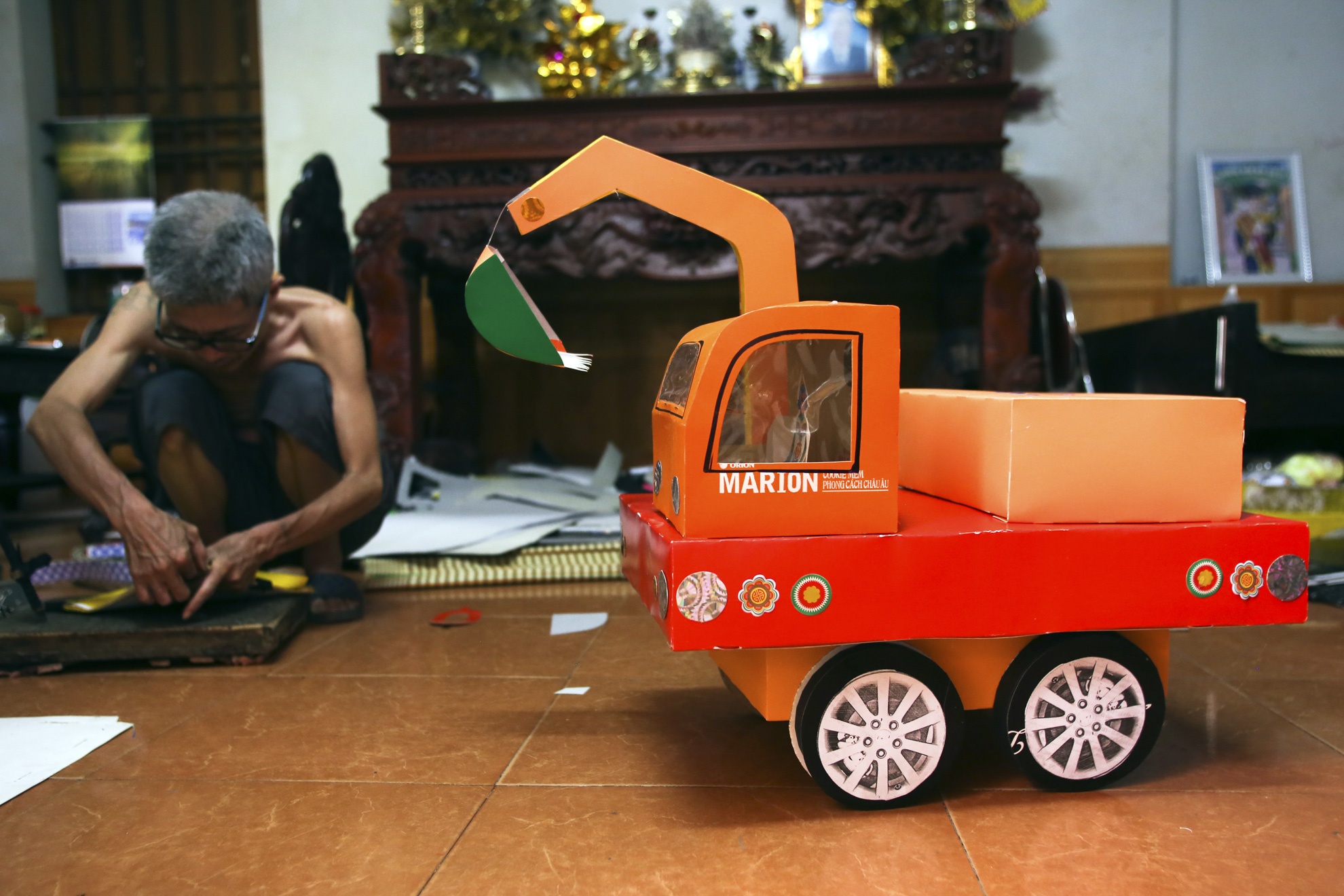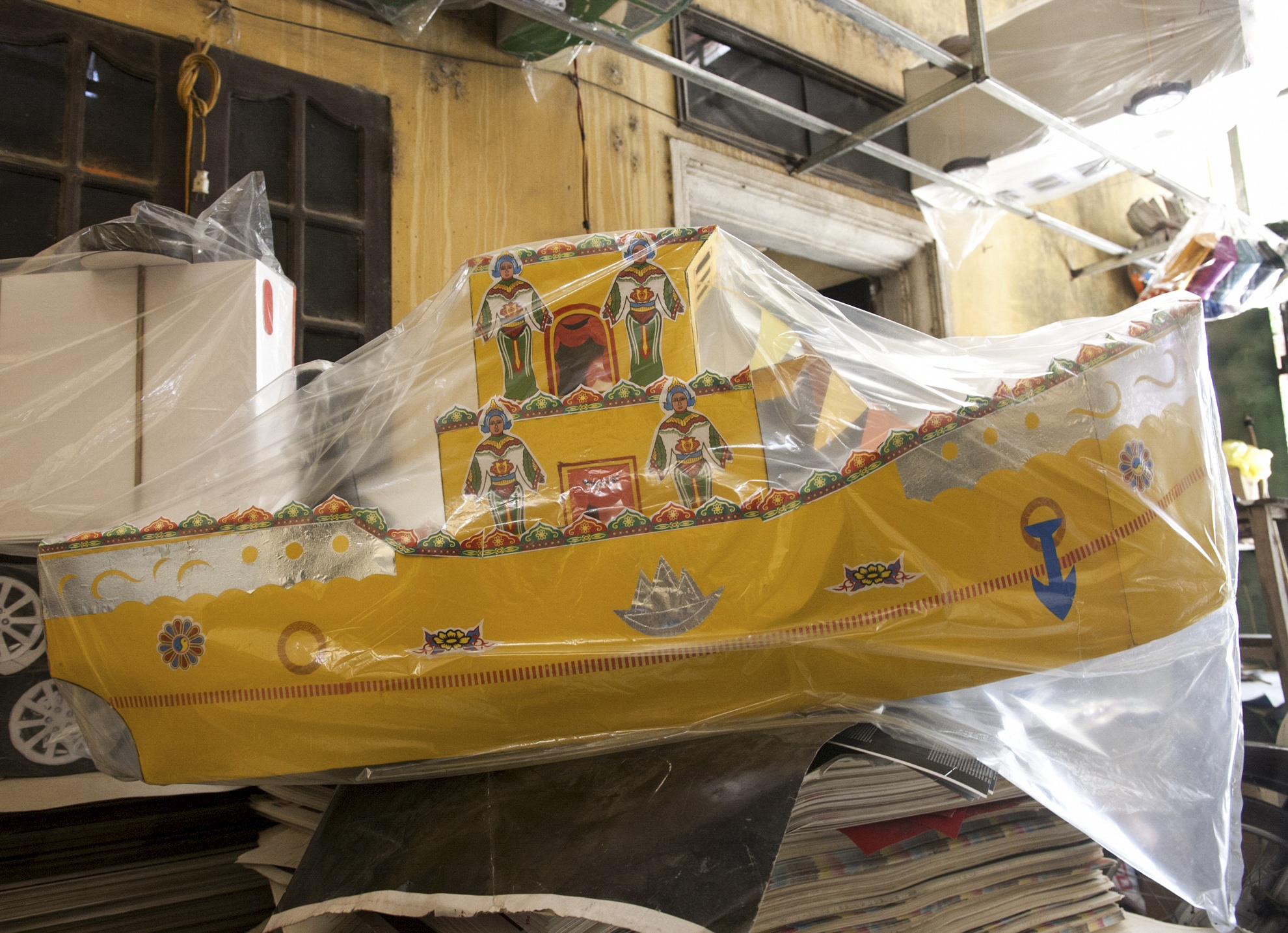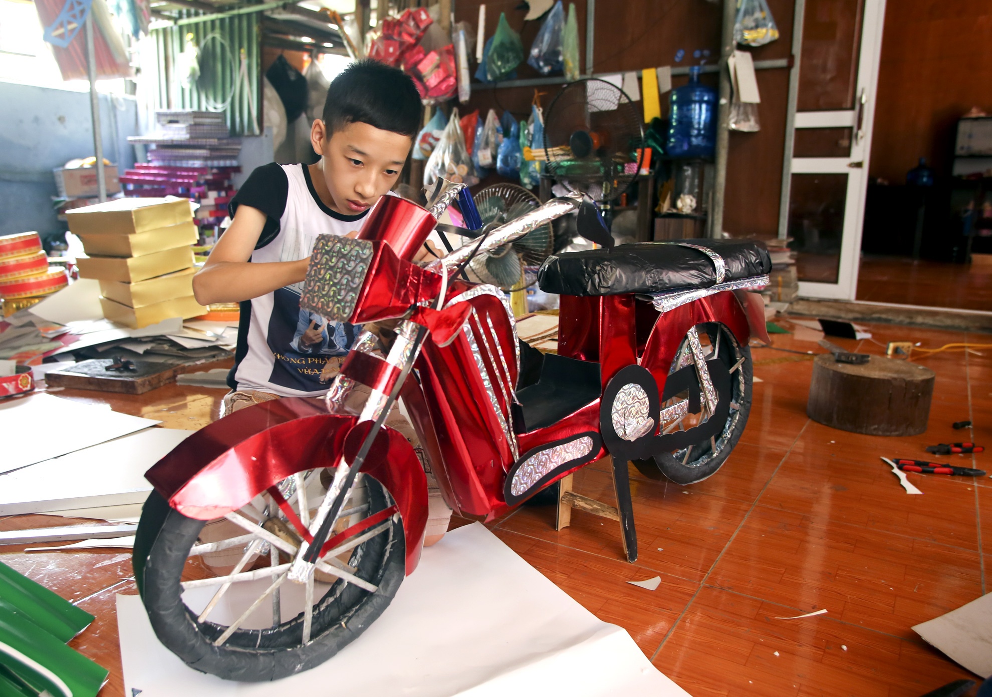 Một chiếc tàu thủy phục vụ người dân đi biển. Chủ xưởng cho biết, một người khách từ Thanh Hóa lên đặt về thắp hương cúng người nhà của họ đi đánh cá ngoài khơi bị mất tích. "Chiếc tàu này hy vọng sẽ đưa ông ấy về với gia đình", anh công nhân lắp ráp nói.
