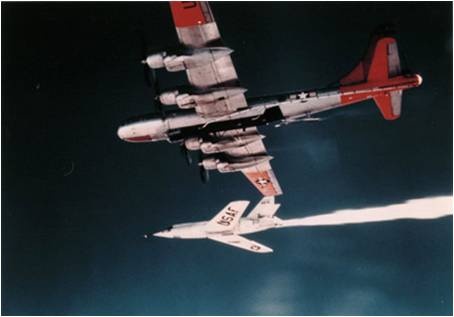 | Máy bay ném bom B-50 thả Bell X-2 Starbuster trong một lần bay thử nghiệm. Ảnh: Wikipedia. |