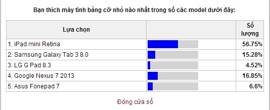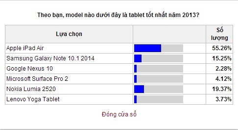 Năm 2013 là một năm bùng nổ số lượng máy tính bảng, khi nhiều hãng công nghệ nhảy vào cuộc đua. Nhờ đó, người tiêu dùng có thêm nhiều lựa chọn hơn so với trước đây. Vẫn còn khá nhiều mẫu tablet xuất sắc ra mắt vào thời điểm cuối năm 2013 và chưa đủ để có được chỗ đứng trong lòng người tiêu dùng Việt Nam. Bảng xếp hạng dưới đây căn cứ vào số lượng bình chọn của độc giả Zing.vn.