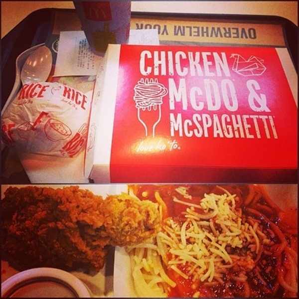 5. McSpaghettiĐây là món McSpaghetti tại McDonald's Philippines. Món mỳ đặc biệt này đi kèm với chân gà tẩm bột và thịt bò băm tưới sốt cà chua. |