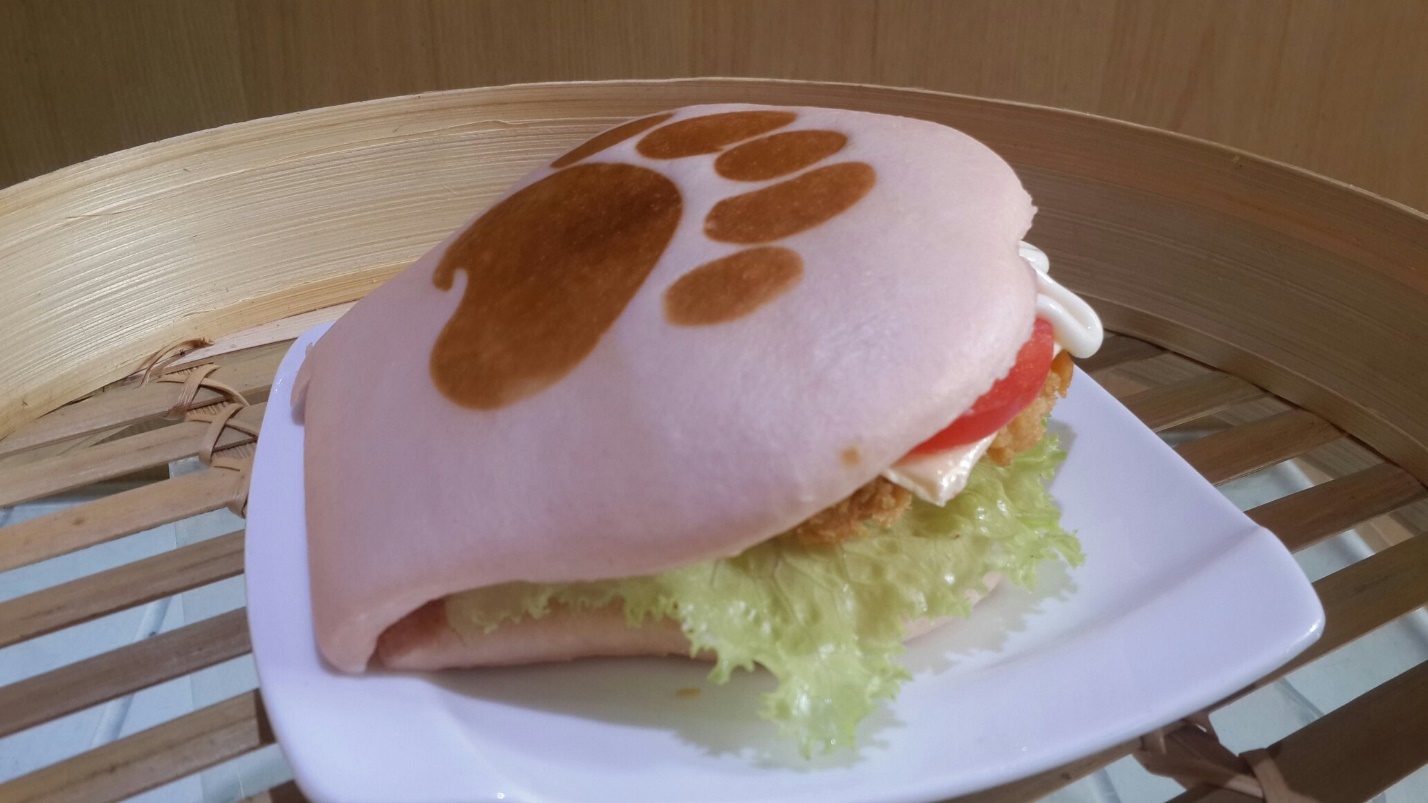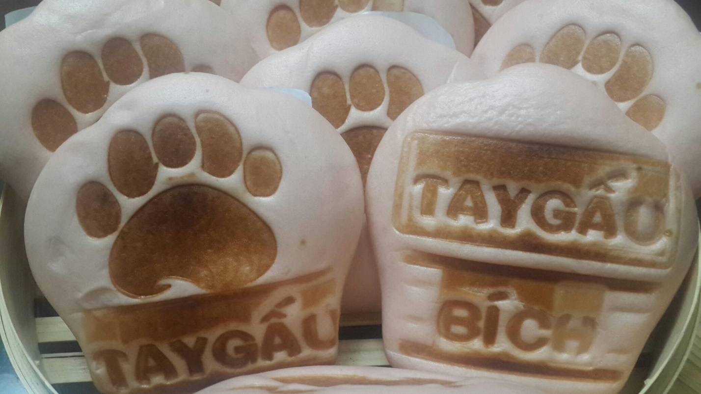 Chiếc bánh đầy sáng tạo này có thể nói là cuộc cách mạng của burger châu Á. Thay vì vỏ bánh nướng một vị, vỏ bánh burger Tay Gấu được làm thành rất nhiều vị như mat cha, chocolate, dâu rừng, sữa tươi... rồi được hấp chín, đóng ấn hình tay gấu rất dễ thương. Nhân bánh được lựa chọn từ thịt gà, cá tươi, tẩm ướp gia vị riêng rồi đem chiên giòn. Chiếc bánh hoàn chỉnh sẽ có lớp vỏ nóng hổi, thơm nức, mềm dai, với nhân bánh gồm gà chiên, cá ba sa lát chiên giòn, dăm bông trứng ốp la, kẹp cùng rau xà lách tươi và cà chua đỏ, phủ lên nhân bánh là lớp tương burger đặc biệt. Bạn trẻ Hà Nội trong những ngày đông lạnh cuối năm vẫn kháo nhau về bánh burger Tay Gấu mới bán ở 148b Bùi Thị Xuân và 45 Hàng Bài, hai cơ sở đầu tiên bán bánh burger Tay Gấu tại Hà Nội.