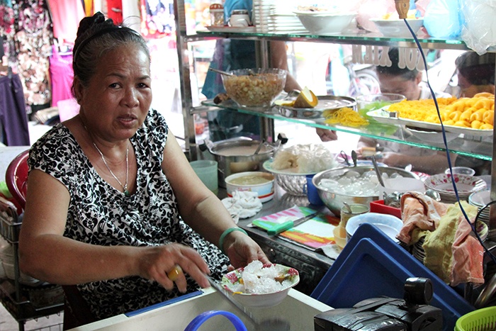 | Bà Huôi, chủ quán người gốc Campuchia cho biết: "Tôi đã gắn bó với quán chè này hơn 20 năm. Đây là chè Campuchia chính gốc". |