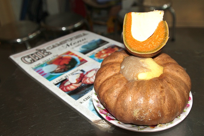 Độc đáo nhất của quán chè Campuchia này phải kể đến món chè bí chưng (tiếng Campuchia gọi là num-à-pơi). Ruột bí được nạo rỗng, thay vào bằng hỗn hợp sữa bột, sữa đặc và cả nước cốt dừa. Tất cả đánh cùng với lòng đỏ trứng, đem hấp cách thủy, sao cho quả bí mềm mà không nhão, lớp vỏ ngoài vẫn còn nguyên không bục. Giá chè này chỉ có 15.000 đồng.