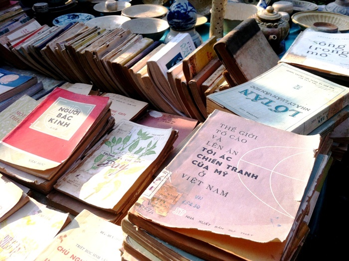 Các cuốn sách cũ từ những năm 60 và 70 được chủ quán sưu tầm và bày bán tại hội chợ, đặc biệt những ấn phẩm tuyên truyền kháng chiến trong thời chiến được rất nhiều bạn trẻ tìm mua. |
