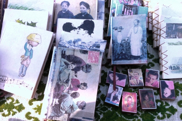 Những cuốn sổ tay và hộp diêm in hình tranh ảnh thời cổ và được làm bằng chất liệu cũ kỹ, thô sơ. |