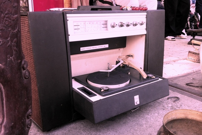 Một chiếc máy hát chạy đĩa đã rất cổ và dù không còn dùng được nhưng vẫn được bày bán tại chợ. |