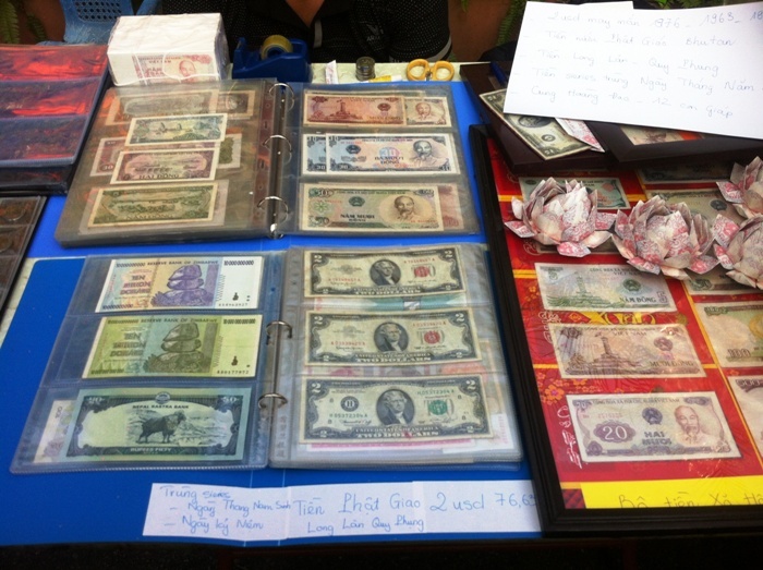 Những bộ sưu tập tiền cổ Việt Nam với các mệnh giá đồng, hào qua các năm cũng xuất hiện tại phiên chợ này. |