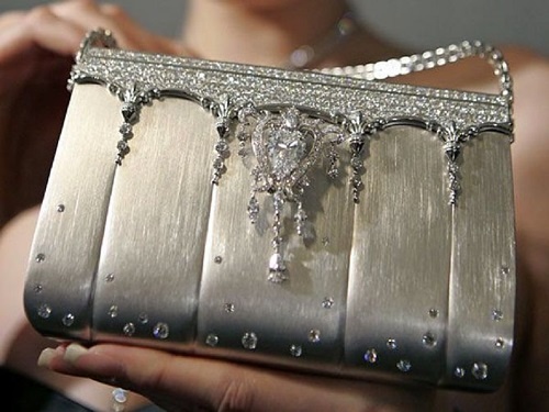 Được đính hơn 2.000 viên kim cương, chiếc túi hiệu Hermes màu bạch kim này là sản phẩm sáng tạo của nhà thiết kế người Nhật Ginza Tanaka. Thiết kế linh hoạt cho phép người dùng có thể dùng chuỗi kim cương làm vòng cổ.