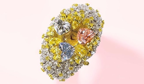 Đây là một trong những vật chỉ thời gian đắt đỏ nhất thế giới. Phần đồng hồ nằm giữa 3 viên kim cương lớn màu hồng, xanh dương và trắng hình trái tim, cùng hàng loạt những viên nhỏ hơn bao quanh. Các viên kim cương này nặng tới 201 carat.
