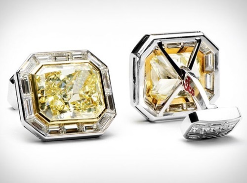 Được làm từ vàng và bạch kim 18 carat, hai chiếc khuy măng sét này còn được đính 2 viên kim cương vàng 21 carat. Ngoài ra, chúng được bao quanh bởi kim cương trắng. Đây là sản phẩm của hãng Jacob & Co.