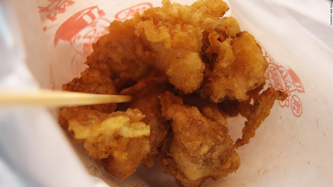 Gà rán: Thịt gà được cắt thành các miếng vừa ăn, ướp gia vị, tẩm bột rồi rán giòn. Sau đó, người bán sẽ rắc thêm chút muối, tiêu và húng quế rán giòn lên trên. Đây là món ăn khuya được nhiều người Đài Loan yêu thích.