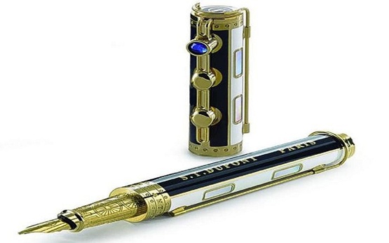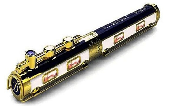 | Bút máy mô phỏng hình đoàn tàu Orient Express với ống khói bằng vàng, toa tàu bằng chất liệu sơn mài và cửa sổ khảm xà cừ của hãng S.T. Dupont, có giá 2.200 bảng (hơn 75 triệu đồng). |