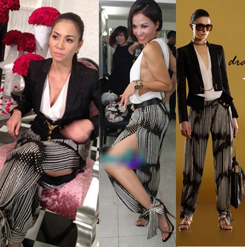 | Bộ đồ từng gây tranh cãi và khiến Thu Minh bị phạt vì ăn vận hở hang cũng có giá không hề rẻ. Chiếc áo khoác là một sản phẩm của Gucci có giá 2.950 USD (hơn 61 triệu đồng). Áo trắng xẻ cổ chữ V và quần xẻ ống cũng thuộc thương hiệu nói trên, có giá lần lượt là 650 và 995 đôla. |