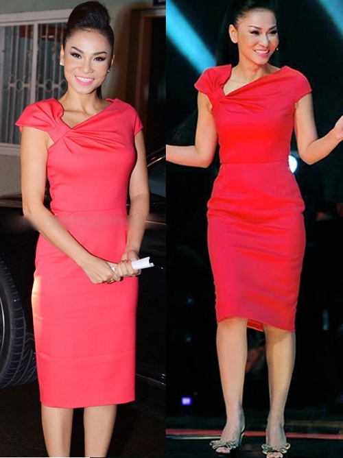 | Thu Minh từng xuất hiện trong chương trình The Voice với chiếc váy Versace 150 triệu đồng. Ví cầm tay ton-sur-ton cũng của thương hiệu này có giá 40 triệu còn giày Christian Louboutin giá 100 triệu đồng. |