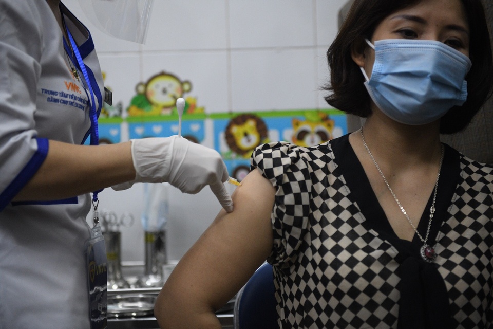 | Tại Hà Nội, chị Vũ Thị Thanh Thư, khoa Nội Tổng Hợp, Bệnh viện Bệnh Nhiệt đới Trung ương, là một trong những người đầu tiên được tiêm vaccine Covid-19. |