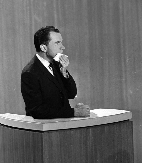 | Nixon liên tục lau mồ hôi trong cuộc tranh luận trực tiếp vào năm 1960. Ảnh: Dallasnews |
