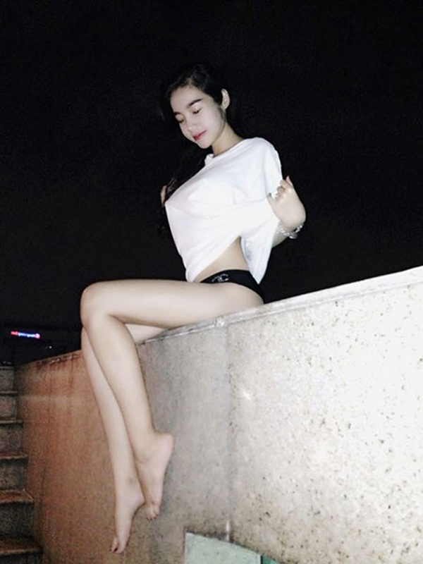 | Trong ảnh, người mẫu 9x Hồng Quế mặc quần lót, áo thun nhưng được kéo cao. |