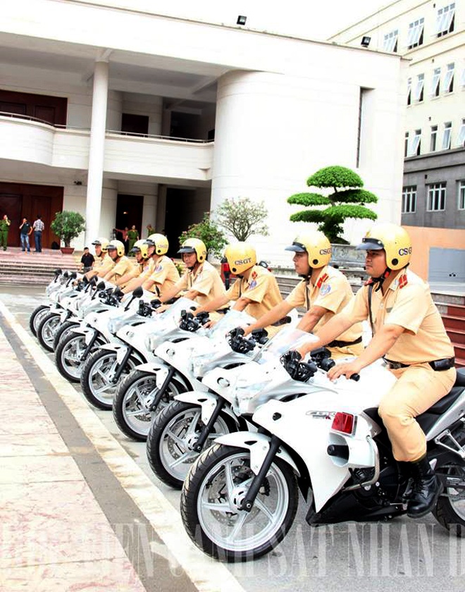 | Hình ảnh các chiến sĩ cảnh sát bên những chiếc mô tô "khủng" trong tác phẩm Trước giờ xuất quân của Nguyễn Huy Hoàng. |