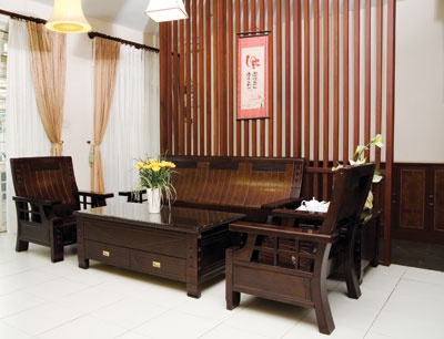 Phòng khách thể hiện sự tiếp đón nồng nhiệt của chủ nhân, với bài trí riêng từ màu gỗ nâu đặc trưng. |