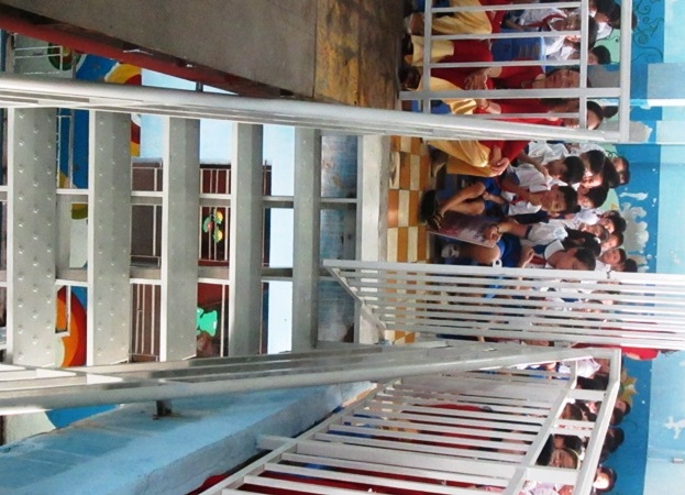 | Các em học sinh phải dự lễ khai giảng trong một không gian chật hẹp, cầu thang thoát hiểm dựng đứng. |
