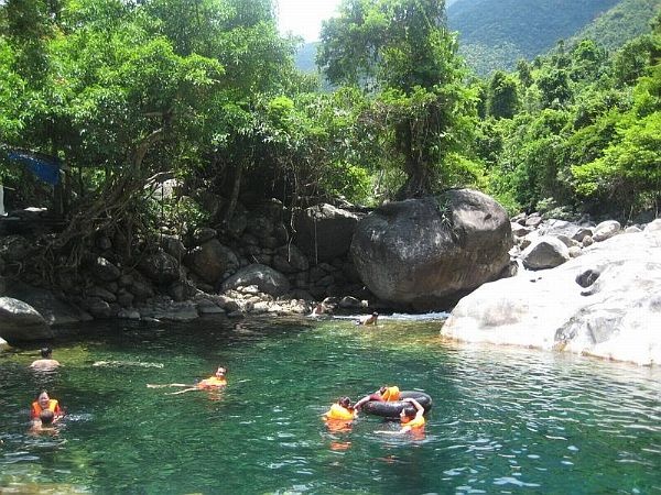 | Suối Mơ với dòng nước xanh trong kết hợp với những phiến đá nằm xen kẽ tạo nên một bức tranh tuyệt đẹp. Đến đây, bạn không chỉ được chiêm ngưỡng dòng suối tuyệt đẹp mà còn được thưởng thức một bữa tiệc âm nhạc của đá và nước. Ảnh: danangtoursim |