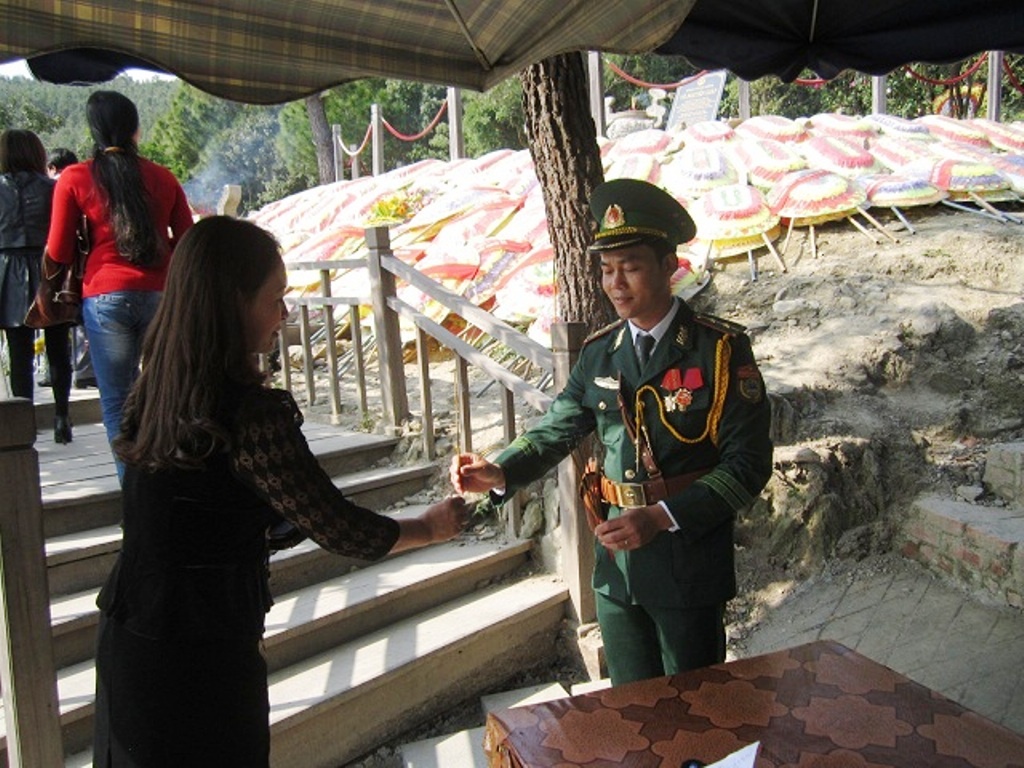 Một điểm ghi tên đón khách, một tốp theo dõi, hướng dẫn khách vào viếng, một tốp thắp hương tại linh cữu. Ngoài ra còn có một tốp khác vòng lên phía sườn núi, bờ biển thực hiện nhiệm vụ tuần tra, không kể ngày đêm”.