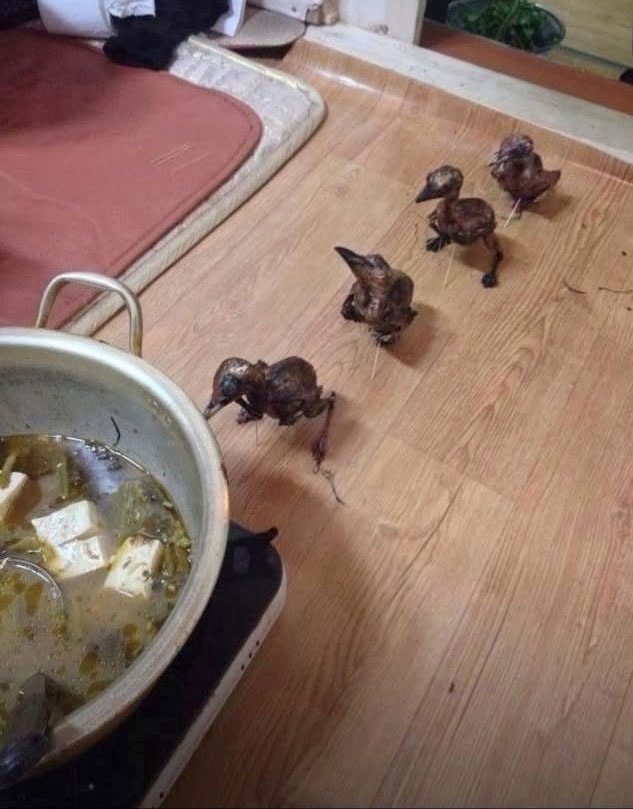 | Từng đôi chim đi vào nồi lẩu. |