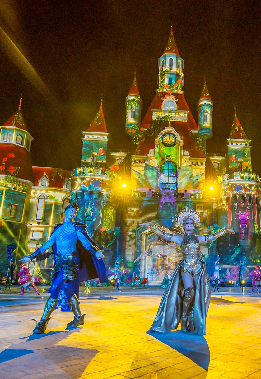 | Đúng 19h30 hàng ngày, tòa lâu đài cao 65 m được thắp sáng lộng lẫy, thu hút du khách từ mọi hướng tụ hội để thưởng thức màn trình diễn ngoạn mục với hàng trăm diễn viên, công nghệ mapping 3D và hệ thống ánh sáng, khói lửa ấn tượng. |