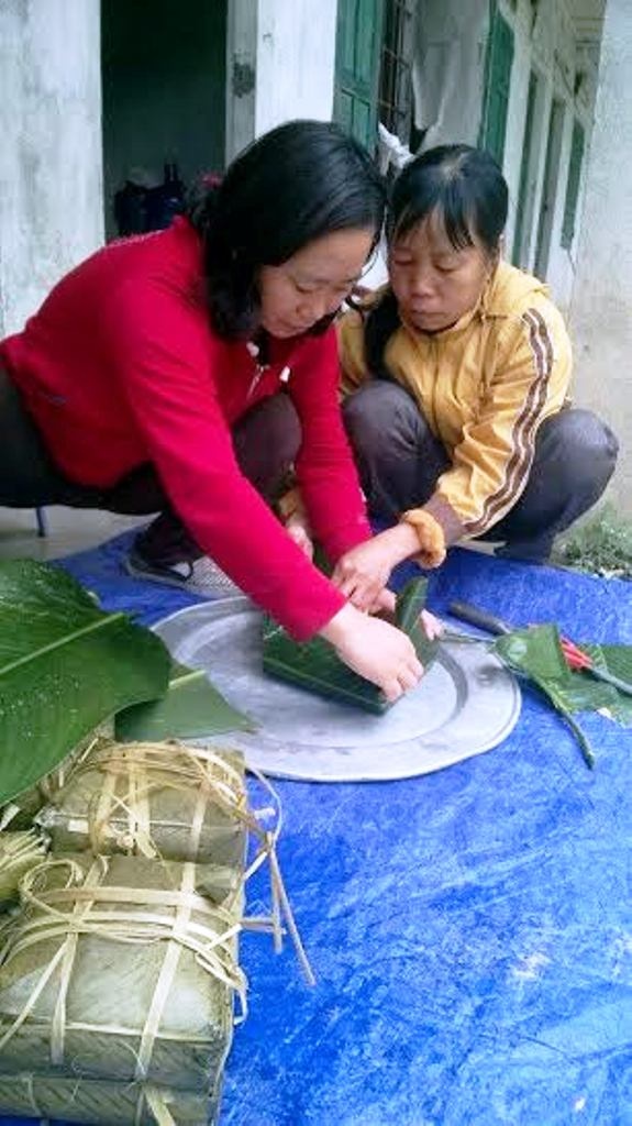 Công nhân ở lại công trường thuỷ điện Lai Châu gói bánh chưng để đón Tết . |