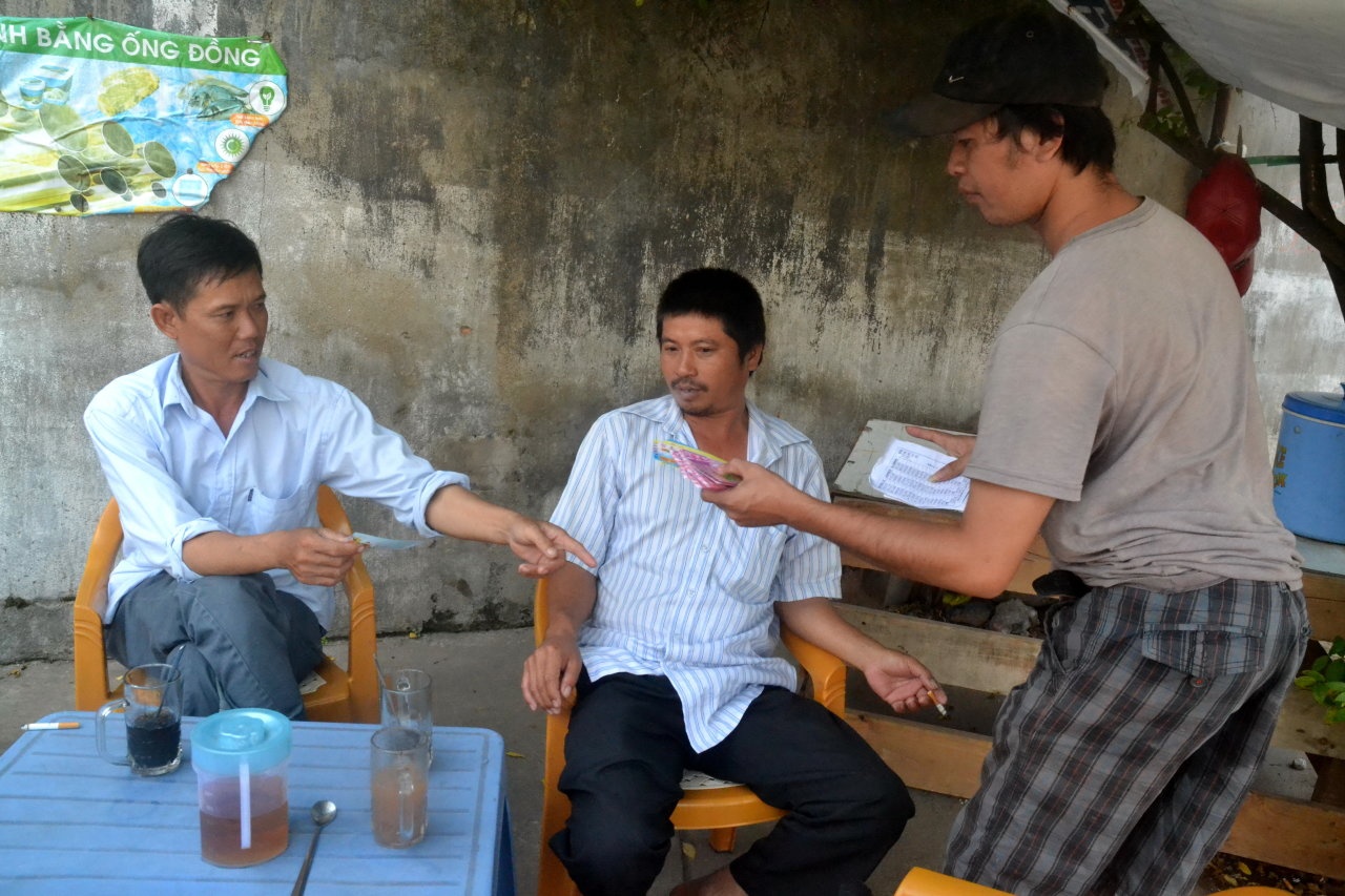 Anh Trần Văn Hùng (đứng) tranh thủ đi bán vé số để kiếm thêm thu nhập sau những giờ làm công nhân ở xưởng mộc. |