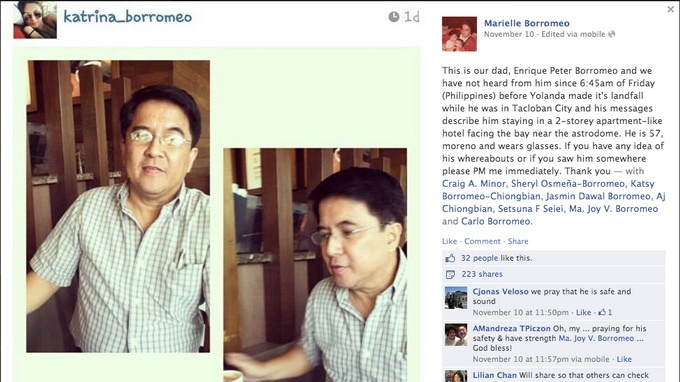 Các con ông, một số đang sống ở Mỹ, hoảng loạn gửi lời nhắn tìm người thân trên khắp các mạng xã hội. Cư dân mạng nhiệt tình cập nhật tình hình ở Tacloban nhưng không có tin gì về ông Borromeo.