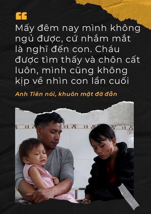 "Mấy đêm nay mình không ngủ được, cứ nhắm mắt là nghĩ đến con. Cháu được tìm thấy và chôn cất luôn, mình cũng không kịp về nhìn con lần cuối", anh Tiên nói, khuôn mặt đờ đẫn.