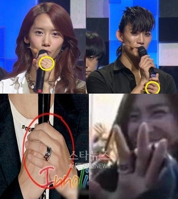 | Trong chương trình Happy Together 3 diễn ra vào đầu tháng 12 năm ngoái, Yoona lên tiếng chính thức về scandal hẹn hò với thành viên Taecyeon của nhóm nhạc 2AM sau khi họ bị chụp ảnh đeo một chiếc nhẫn khá giống nhau. |