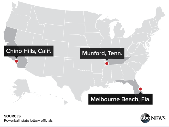 | Địa điểm 3 chiếc vé số may mắn được bán ra. Ảnh: ABC News |