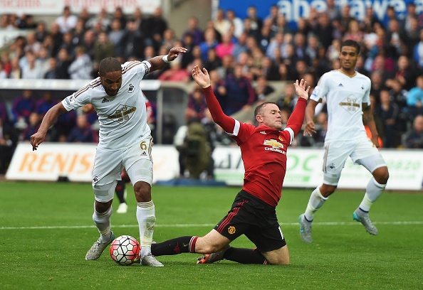 | Rooney ngã trong khu vực 16m50 của Swansea. Anh tỏ ra chậm chạp và không thể hiện được khả năng tỳ đè tốt khi tranh bóng với trung vệ Williams. Ảnh: Getty Images. |
