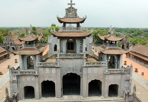 Nhà thờ đá Phát Diệm - Ninh Bình. Quần thể NT Phát Diệm (Ninh Bình) được khởi công xây dựng từ năm 1875, trong đó NT Chánh toà xây dựng năm 1891, dài 80 mét, rộng 24 mét, được chống đỡ bởi những cây cột lim to lớn, mặt chính hướng ra phía hồ nước ở giữa có đảo nhỏ dựng tượng chúa Ki Tô. Năm 1889, xây dựng điện Trái tim Đức Mẹ dài 15 mét, rộng 9 mét, với vật liệu tất cả đều là đá (nên NT Phát Diệm còn được gọi là NT Đá). Nét độc đáo của quần thể NT này là mô phỏng theo lối kiến trúc đình, chùa Việt Nam và mặc dù xây dựng trên vùng đất bùn lầy, đã hàng trăm năm qua nhưng không hề bị lún.