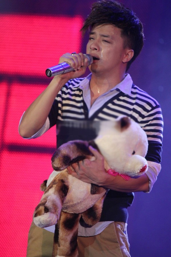 | Cao Thái Sơn đầm đìa nước mắt dù đang hát nhép trong một chương trình âm nhạc. |