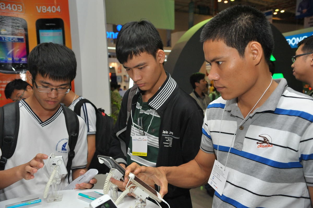 | Khách tham quan có dịp trải nghiệm các siêu phẩm di động hàng đầu với những tiện ích của “thành phố công nghệ”. |