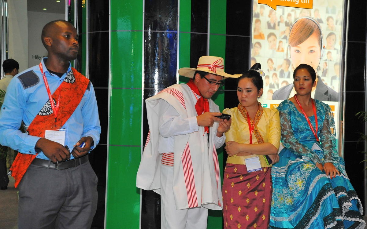 Tập đoàn viễn thông Quân đội (Viettel) tham gia triển lãm bằng dàn nhân viên đến từ châu Á, Phi và Mỹ Latinh với các ngôn ngữ, trang phục đặc biệt.