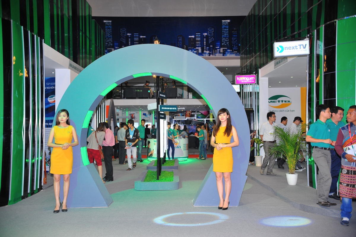 | Nằm ngay lối đi vào triển lãm, với boot trưng bày lớn và nhiều không gian trải nghiệm khác nhau với chủ đề “thành phố công nghệ”, Viettel là công ty có lực lượng hùng hậu nhất tại Vietnam Telecomp năm nay. Điều ấn tượng khách tham quan nhất là những nhân viên nước ngoài đến từ 3 châu lục. Họ ăn mặc các trang phụ dân tộc, nói tiếng Anh và thể hiện sự thân thiện với khách tham quan. |