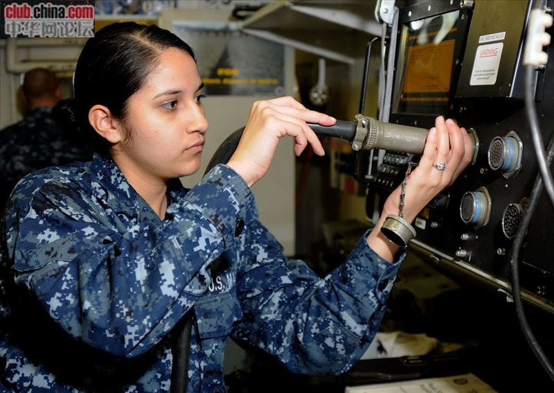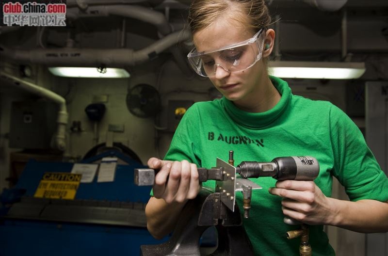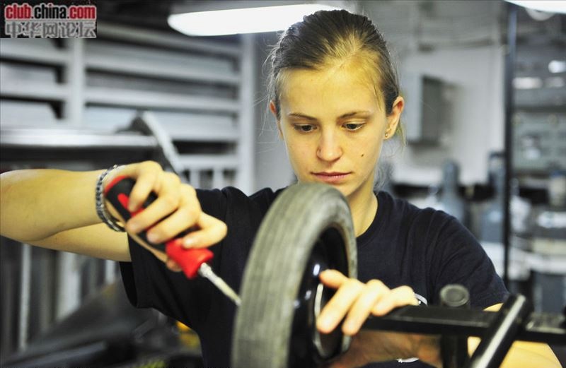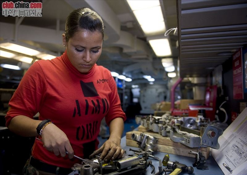 | Họ không ngần ngại đối với những công việc lấm đầy dầu mỡ. Trong ảnh, một nữ quân nhân đang kiểm tra các chi tiết kỹ thuật trên tàu sân bay USS Harry S. Truman (CVN 75). Ảnh: Tuku.military.china. |