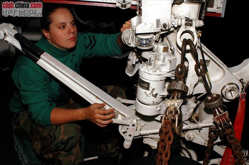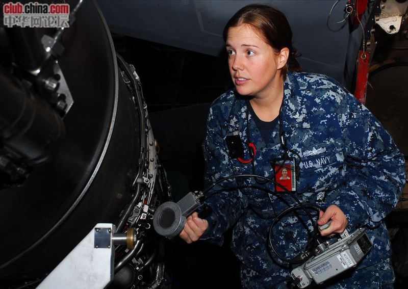 | Bảo trì máy bay là một công việc khá nặng nhọc. Các nhân viên kỹ thuật phải có kỹ năng thành thạo và sức khỏe để đáp ứng yêu cầu của công việc. Tuy nhiên, công việc này trên tàu sân bay Mỹ lại được giao cho nữ quân nhân. Ảnh: Tuku.military.china. |