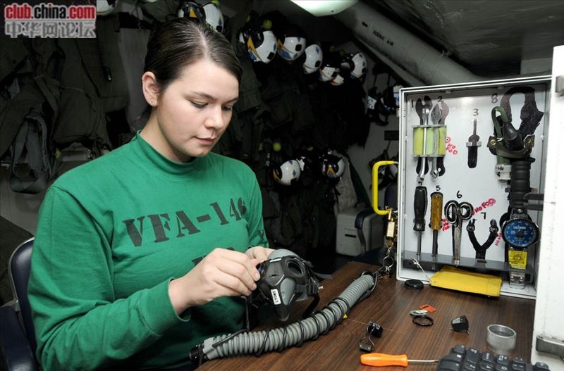 | Nữ nhân viên đang kiểm tra mặt nạ dưỡng khí của phi công. Theo quy định, nhân viên mang đồng phục màu xanh có nhiệm vụ bảo trì trực tiếp cho phi đội tiêm kích VFA-146 với biệt hiệu "Kim cương xanh" trên tàu sân bay USS Nimitz (CVN-68). Ảnh: Tuku.military.china. |